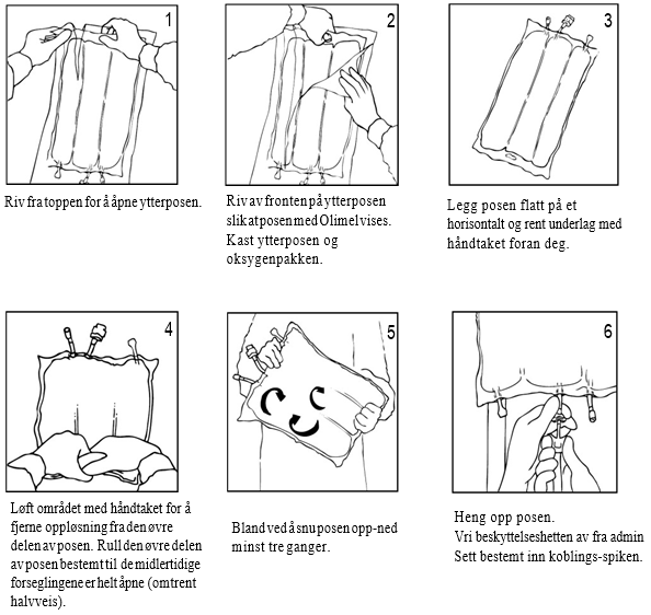 Produktet skal kun administreres etter at de ikke-permanente forseglingene mellom de tre kamrene er brutt og innholdet av de 3 kamrene er blandet.
