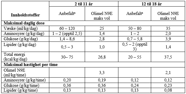 For Olimel N9E i aldergruppen 2 til 11 år, er de begrensende faktorene magnesium konsentrasjon for daglig dose og glukose konsentrasjon for hastighet per time. I aldergruppen 12 til 18 år er, de begrensende faktorene aminosyre og magnesium konsentrasjon for daglig dose og aminosyre konsentrasjonen for hastighet per time. Dette medfører følgende inntak: