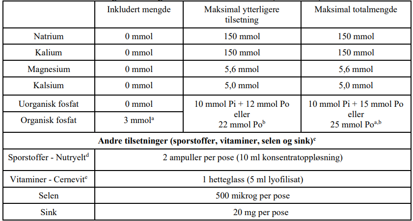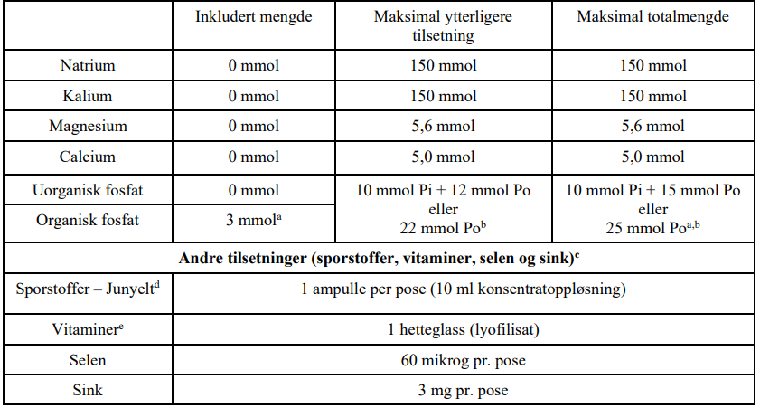 c For alle posestørrelser kan tilsetningen av sporstoffer, vitaminer, selen og sink være det samme som for poser på 1000 ml.