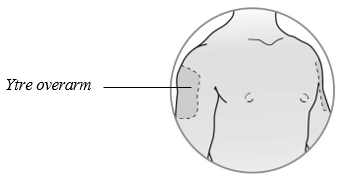 Velg et injeksjonssted i enten magen, forsiden av lårene eller ytre overarm (kun dersom omsorgspersonen administrerer).