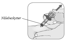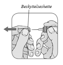 Fjern beskyttelseshetten ved å holde den ferdigfylte sprøyten i sprøytekroppen med én hånd og dra hetten rett av med den andre hånden.