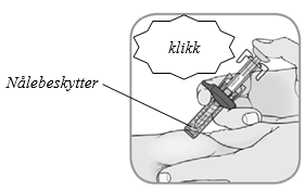 Bekreft: etter en fullført injeksjon vil nålebeskytteren dekke til nålen og du kan høre et klikk.