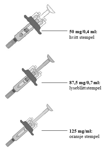 Typen ferdigfylt sprøyte som du mottar avhenger av hvilken dose legen har forskrevet til deg. 125 mg/ml ferdigfylt sprøyte er vist nedenfor.Før bruk