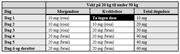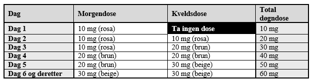 Legen forteller deg hvordan du skal øke dosen når du begynner med Otezla. Legen din kan råde deg til å bare ta morgendosen som er vist i tabellen ovenfor som gjelder for deg (for voksne eller for barn/ungdom), og at du hopper over kveldsdosen.