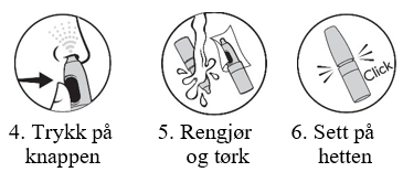 For å unngå at flasken drypper, stå oppreist og før den korte dysen inn i et nesebor.