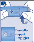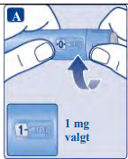 Det er kun dosetelleren og dosepekeren som viser at 1 mg har blitt valgt. Du kan kun velge 1 mg per dose. Når pennen inneholder mindre enn 1 mg, stopper dosetelleren før 1 mg vises. Dosevelgeren klikker forskjellig når den vris forover, bakover eller forbi 1 mg. Ikke tell penneklikkene. |
