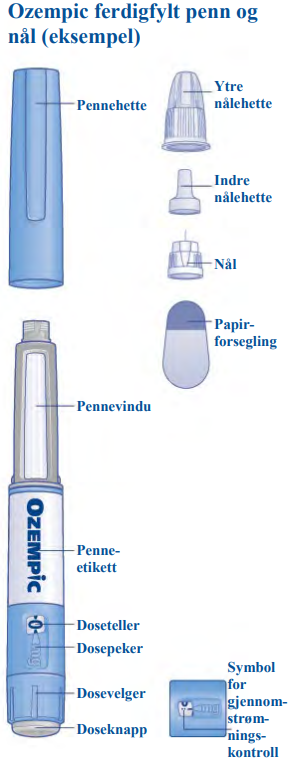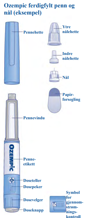 Snakk med lege, sykepleier eller apotek om hvordan du skal injisere Ozempic riktig. Start med å kontrollere pennen for å forsikre deg om at den inneholder Ozempic 1 mg, se deretter på illustrasjonene nedenfor for å bli kjent med de ulike delene av pennen og nålen. Hvis du er blind eller svaksynt og ikke kan lese av dosetelleren på pennen, må du ikke bruke denne pennen uten hjelp. Få hjelp fra en person med godt syn som vet hvordan Ozempic ferdigfylt penn skal brukes. Pennen er en ferdigfylt penn med dosevelger. Pennen inneholder 4 mg semaglutid, og du kan kun velge doser på 1 mg. En ubrukt penn inneholder fire doser à 1 mg.