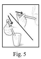 Ta legemidlet ved å plassere doseringspipetten i munnen og presse lett på stemplet. Press stemplet helt inn for å sikre at all oppløsning brukes. Dersom du ønsker kan du fortynne legemidlet i et glass vann eller alkoholfri drikke før du tar det. Drikk i så tilfelle hele glasset for å sikre at du får riktig dose av legemidlet (Fig. 5)