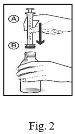 Sett flasken på en fast og jevn overflate. Åpne plastposen med doseringspipette/adapter i den perforerte enden og ta ut doseringspipetten (A) med påsatt adapter (B). Sett adapter med doseringspipetten godt fast i flaskehalsen (Fig. 2).