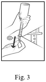 Snu flasken opp ned for å fylle doseringspipetten. Mens du holder doseringspipetten på plass, trekker du forsiktig stemplet (C) ned til streken som tilsvarer dosen legen har forskrevet (se avsnittet "Hvordan du bruker Palexia”). Ta ikke ut doseringspipetten på dette tidspunktet! (Fig. 3)
