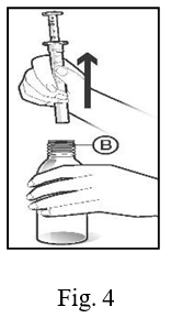 Snu flasken riktig vei og ta deretter doseringspipetten forsiktig ut av flasken. Etter at du har tatt ut doseringspipetten sjekker du nøye at du har tatt riktig mengde av oppløsningen. Adapteren (B) som var festet til doseringspipetten skal nå stå igjen i flasken (Fig. 4).