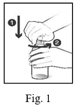 Flasken har barnesikret skrukork. For å ta av korken, press den ned og skru den mot klokken (Fig. 1). Ta av korken og riv av forseglingen på toppen av flasken. Hvis forseglingen er skadet skal du ikke bruke legemidlet, men snakke med apotek.
