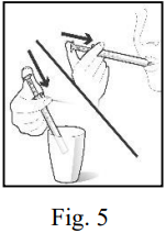 Ta legemidlet ved å plassere doseringspipetten i munnen og presse lett på stemplet. Press stemplet helt inn for å sikre at all oppløsning brukes. Dersom du ønsker kan du fortynne legemidlet i et glass vann eller alkoholfri drikke før du tar det. Drikk i så tilfelle hele glasset for å sikre at du får riktig dose av legemidlet (Fig. 5)