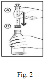 Sett flasken på en fast og jevn overflate. Åpne plastposen med doseringspipette/adapter i den perforerte enden og ta ut doseringspipetten (A) med påsatt adapter (B). Sett adapter med doseringspipetten godt fast i flaskehalsen (Fig. 2).