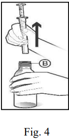 Snu flasken riktig vei og ta deretter doseringspipetten forsiktig ut av flasken. Etter at du har tatt ut doseringspipetten sjekker du nøye at du har tatt riktig mengde av oppløsningen. Adapteren (B) som var festet til doseringspipetten skal nå stå igjen i flasken (Fig. 4).