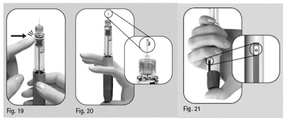 4. Trykk doseinnstillingsknappen ned så langt det går. En liten væskedråpe vil komme ut av kanylespissen (figur 20).