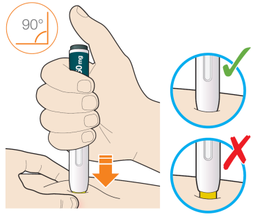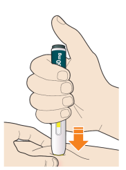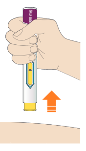 Trykk pennen rett ned mot huden til det gule sikkerhetsdekslet er trykket helt inn i pennen, og hold (se bilde).