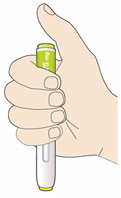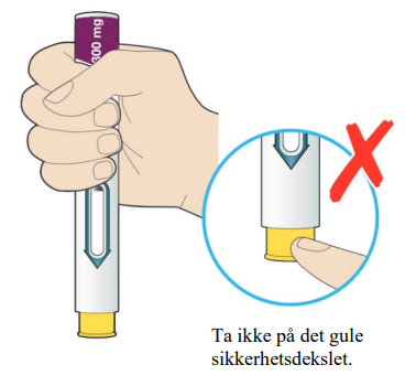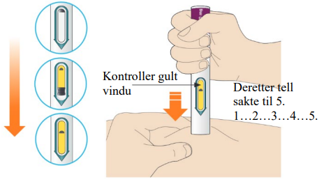 Trykk og hold pennen fast mot kroppen til det gule sikkerhetsdekslet ikke er synlig lenger. Pennen virker ikke dersom det gule sikkerhetsdekslet ikke er trykket helt inn.