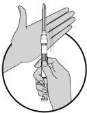 2. Slik blander du væsken med pulveret: Hold sprøyten RETT OPP (loddrett, med spissen opp), og press stemplet LANGSOMT (bruk ca. 5-10 sekunder) oppover, helt til proppen er ved den blå streken midt på sylinderen.