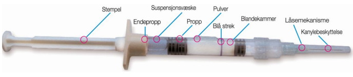 Ferdigfylt injeksjonssprøyte med to kammer - pulver og væske i hvert sitt kammer.