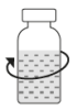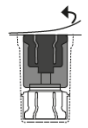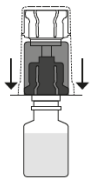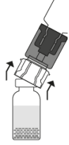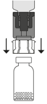 Plasser hetteglasset med Prolastina pulver i stående posisjon på underlaget. Snu enheten med hetteglasset med oppløsningsvæsken og adapteren opp-ned 180º. Press den gjennomsiktige/hvite delen av adapteren rett ned – uten å vri – inntil nålen perforerer proppen og overføringssettet klikker på plass.