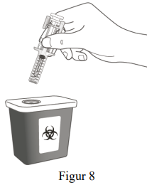 Brukte sprøyter skal kastes i en punkturresistent beholder, f.eks en kanylebøtte (se figur 8). For din og andres helse og sikkerhet, bruk aldri sprøyter på nytt. Kast kanylebøtten i henhold til lokale retningslinjer.