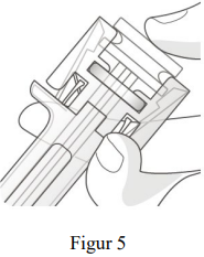 Injiser hele mengden legemiddel ved å trykke ned stempelet helt til stempelet er fullstendig nede mellom kanylebeskyttelsevingene (se figur 5).