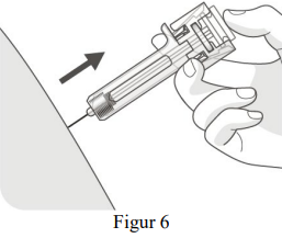 Når stempelet er så langt ned som det kan gå, fortsett å trykke på stempelhodet mens du drar ut kanylen og slipper huden (se figur 6).
