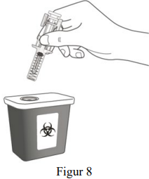 Brukte sprøyter skal kastes i en punkturresistent beholder, f.eks en kanylebøtte (se figur 8). For din og andres helse og sikkerhet, bruk aldri sprøyter på nytt. Kast kanylebøtten i henhold til lokale retningslinjer.
