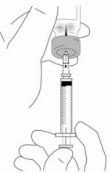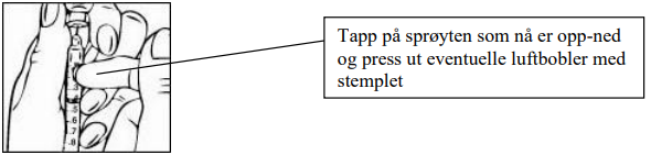 8. Mens nålen fortsatt er i hetteglasset som er opp-ned, ser du etter luftbobler i sprøyten. Slå forsiktig på sprøyten for å få eventuelle luftbobler til å stige til toppen av sprøyten. Vær sikker på at du fortsatt holder på hetteglasset og sprøyten. Press stemplet langsomt inn til alle luftbobler er fjernet. Dersom du presser oppløsning tilbake i hetteglasset, trekkes stemplet langsomt tilbake for å trekke riktig mengde oppløsning tilbake i sprøyten. På grunn av sikkerhetsutformingen på sprøyten kan en liten luftboble være vanskelig å fjerne. Du trenger ikke bekymre deg for dette. Det vil ikke påvirke nøyaktigheten på dosen eller utgjøre noen helserisiko for deg.