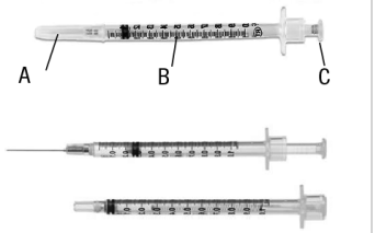 A - nåledeksel, B - sylinder, C - stempel