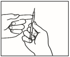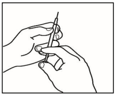 4.3 Ta beskyttelseshylsen av kanylen på den klargjorte injeksjonssprøyten. Ta forsiktig tak i den rengjorte huden på injeksjonsstedet med en hånd. Med den andre hånden holder du sprøyten som du holder en blyant.
