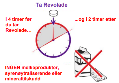Bruk ikke Revolade sammen med mat eller drikke som inneholder melk siden kalsium i melkeproduktene påvirker absorpsjonen av legemidlet. For ytterligere informasjon, se ‘Når du skal ta det’ i avsnitt 3.