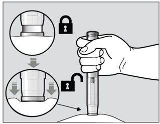 For å låse den opp, trykk den ferdigfylte pennen bestemt mot den sammenklemte huden til nålebeskyttelsen er fullstendig trykt inn (se figur I).