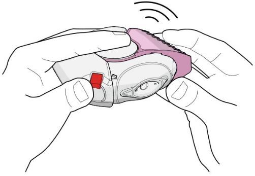 1. For å åpne inhalatoren, hold inhalatoren flatt med den ene hånden. Hold inhalatoren flatt i hånden for å åpne den. Trykk ned den røde knappen med tommelen (se figur 1) og roter det lyserosa (for 50/100 mikrogram) eller rosa (for 50/250 mikrogram) munnstykkedekselet så langt det går, til du hører et klikk (se figur 2) med den andre hånden. Dette åpner et lite hull i munnstykket og plasserer en dose med legemidlet i munnstykket.