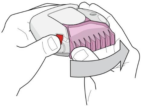 4. Lukk inhalatoren for å holde den ren, ved å rotere det lyserosa (for 50/100 mikrogram) eller rosa (for 50/250 mikrogram) munnstykket så langt tilbake mot deg som det går. Du skal høre et klikk (se figur 4). Munnstykkedekselet har nå gått tilbake til den opprinnelige plasseringen og er nullstilt. Inhalatoren er nå klar til du skal ta den neste planlagte dosen.