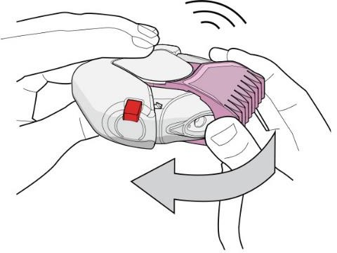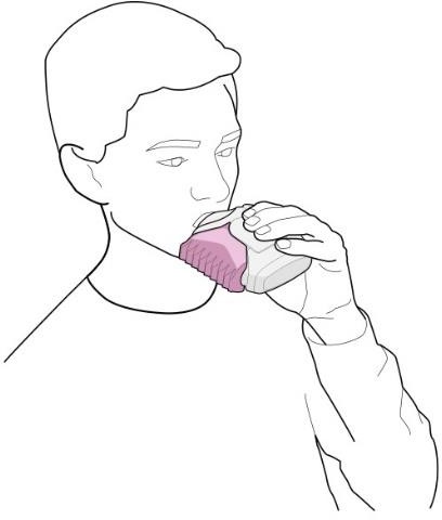 2. Hold inhalatoren bort fra munnen, pust ut så langt det er komfortabelt. Ikke pust ut i inhalatoren