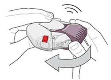 4. Lukk inhalatoren for å holde den ren ved å rotere det lilla (for 50/500 mikrogram) munnstykket så langt tilbake mot deg som det går. Du skal høre et klikk (se figur 4). Munnstykkedekselet har nå gått tilbake til den opprinnelige plasseringen og er nullstilt. Inhalatoren er nå klar til bruk igjen.