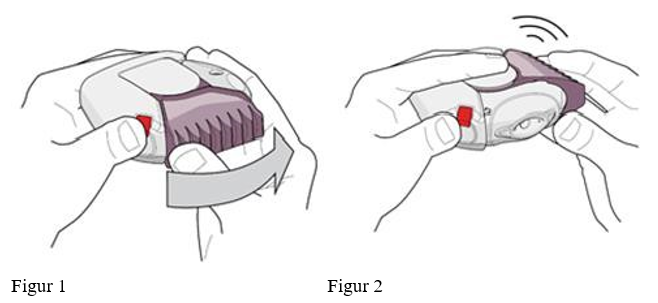 1. For å åpne inhalatoren, hold inhalatoren flatt med den ene hånden. Trykk ned den røde knappen med tommelen (se figur 1) og roter det lilla (for 50/500 mikrogram) munnstykkedekselet så langt det går, til du hører et klikk (se figur 2) med den andre hånden. Dette åpner et lite hull i munnstykket og plasserer en dose med legemidlet i munnstykket.