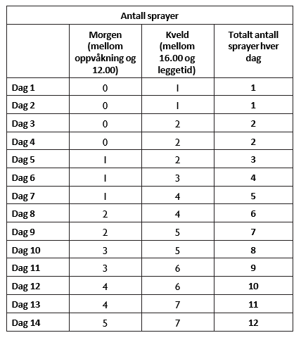 Ta sikte på å bruke dette antallet sprayer hver dag. Sprayene kan deretter fordeles jevnt utover hele dagen.