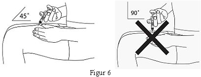Plasser sprøyten i ca. 45 graders vinkel til hudfolden. Med en rask enkeltbevegelse stikkes nålen inn gjennom huden så langt som det går (se figur 6).