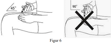 Plasser sprøyten i omtrent 45 graders vinkel til hudfolden. Med en rask enkelbevegelse stikkes nålen inn gjennom huden så langt som det går (se figur 6).