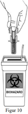 Kast den ferdigfylte sprøyten i en kanylebøtte umiddelbart. Forsikre deg om at bøtten destrueres som instruert av lege eller sykepleier.