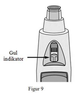 Den gule indikatoren er koblet til stempelet i den ferdigfylte pennen. Dersom den gule indikatoren ikke er synlig i vinduet så har ikke stempelet flyttet seg riktig, og injeksjonen har ikke skjedd.