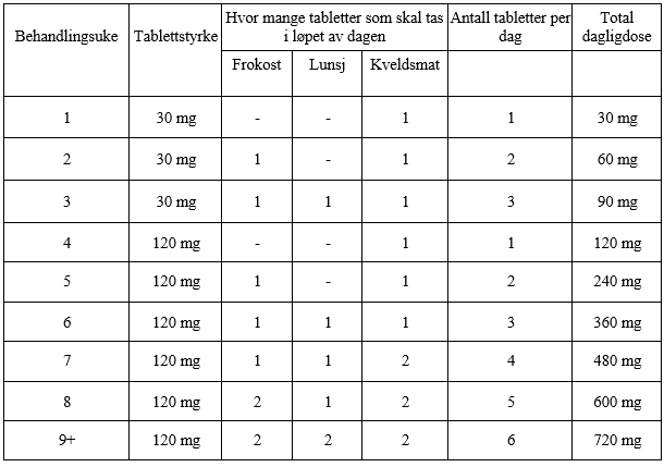 Legen vil begynne behandlingen med en lav dose av Skilarence ved bruk av 30 mg tabletter. Dette hjelper kroppen din med å bli vant til legemidlet og reduserer risikoen for bivirkninger, slik som mage- og tarmproblemer. Dosen vil bli økt med 30 mg hver uke som vist i tabellen nedenfor. Når du oppnår en dose på 120 mg Skilarence daglig, vanligvis fra og med uke 4, kan du bytte til 120 mg tabletter dersom dette er hensiktsmessig. Når du bytter fra tabletter på 30 mg til 120 mg, forsikre deg om at du bruker riktig tablett og dose.