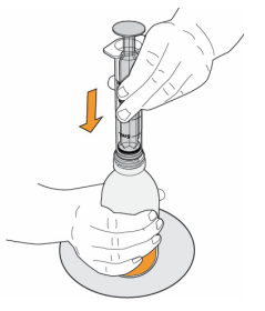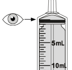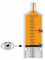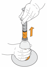 Snu flasken forsiktig opp ned og trekk i stempelet for å måle opp dosen din. Med tuppen vendt opp må toppen av den svarte gummiproppen være på linje med den forskrevne dosen.