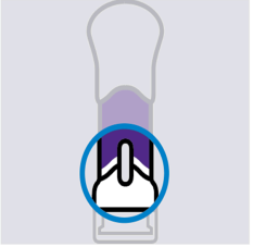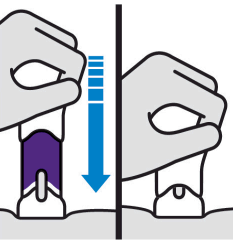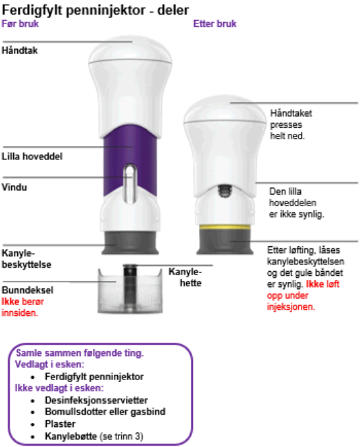 Ved injeksjon, press håndtaket helt ned til den lilla hoveddelen ikke er synlig, for å injisere hele dosen. IKKE LØFT OPP DEN FERDIGFYLTE PENNEN under injeksjon! Hvis du gjør det, låses den ferdigfylte pennen og du får ikke tatt hele dosen.
