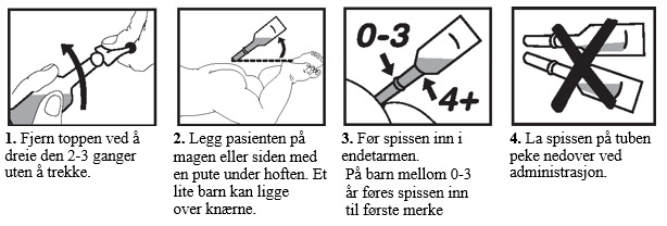 Stesolid rektalvæske, oppløsning skal føres inn i endetarmen.