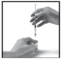 1. Hold i sprøyten og hetteglasset. Før nålen gjennom den sterile gummiforseglingen og inn i hetteglasset.