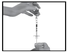 3. Snu hetteglasset og sprøyten opp ned. Med nålen i oppløsningen, trekkes stemplet ut for å trekke opp korrekt dose i sprøyten.